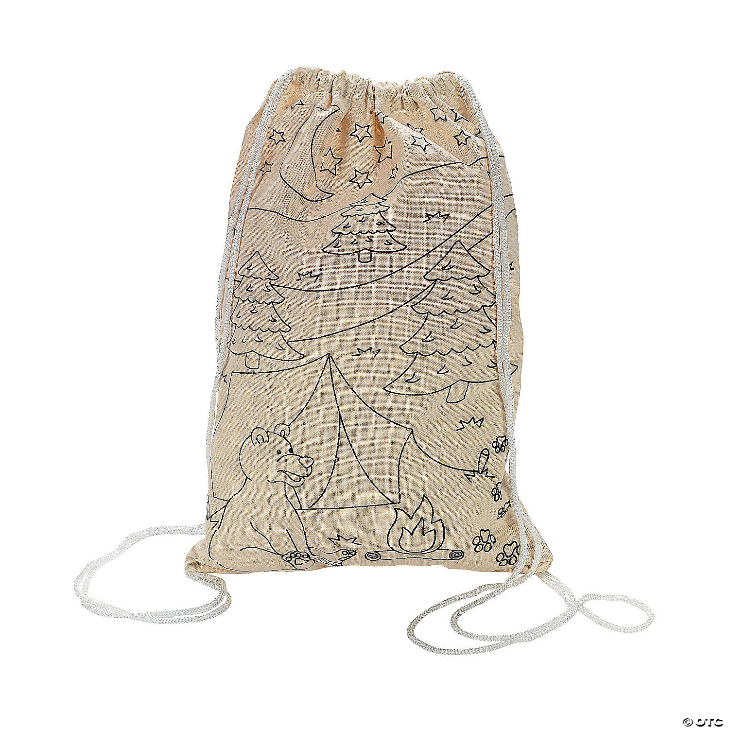 Add some colorific fun to your child's camping-theme birthday party, with these color your own activities. The drawstring bags come pre-printed with a camp scene that kids can use their imagination and a little color to complete. Once the party guests have finished painting their bag, fill these bags full of party favors - individually wrapped candies or small novelties (sold separately on this site) - to take home.