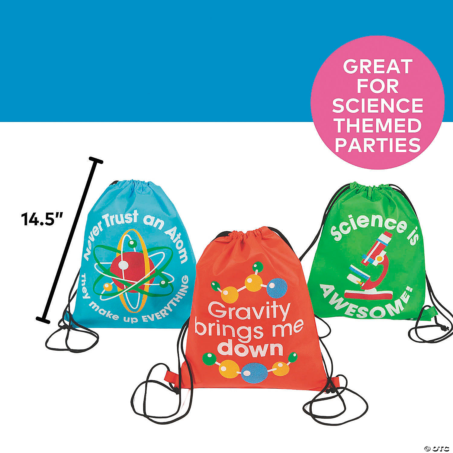 Silly scientific statements like, gravity brings me down, make these colorful Medium Science Party Drawstring Bags fun. Buy them by the dozen as an affordable and fun science party essential. © OTC