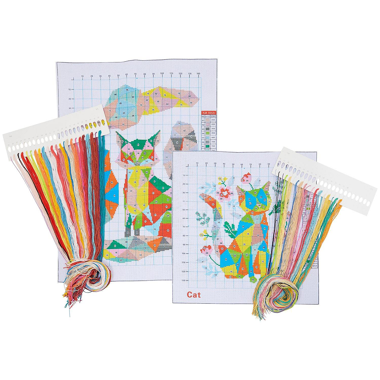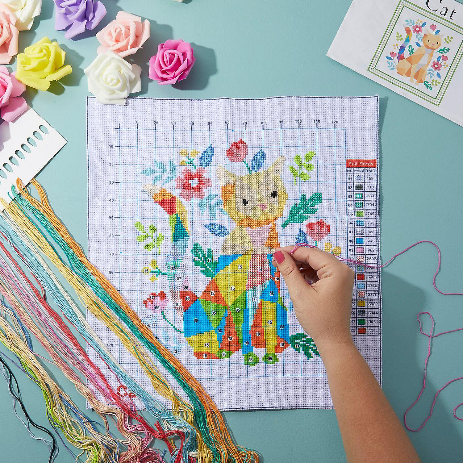 2 Pack, Fox and Cat Stamped Counted Cross Stitch, DIY Embroidery Beginner Kit with 11 CT Cloth, Needles & Thread