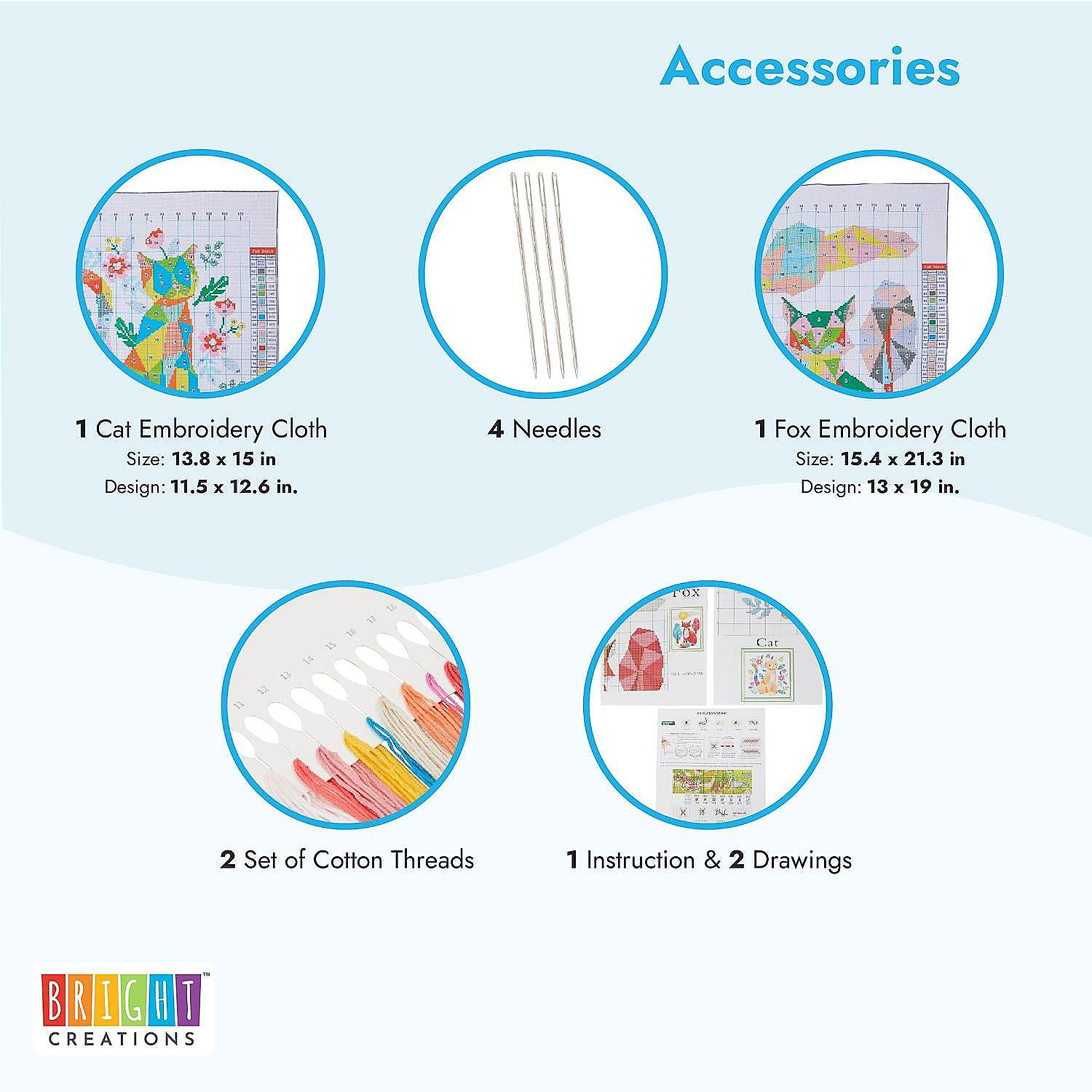 What's Included: The cross stitch kit includes 1 fox pattern stamped cloth, 1 cat pattern stamped 11 CT cloth, 4 needles, 2 cotton thread sets, 1 instruction sheet, and 2 drawings
