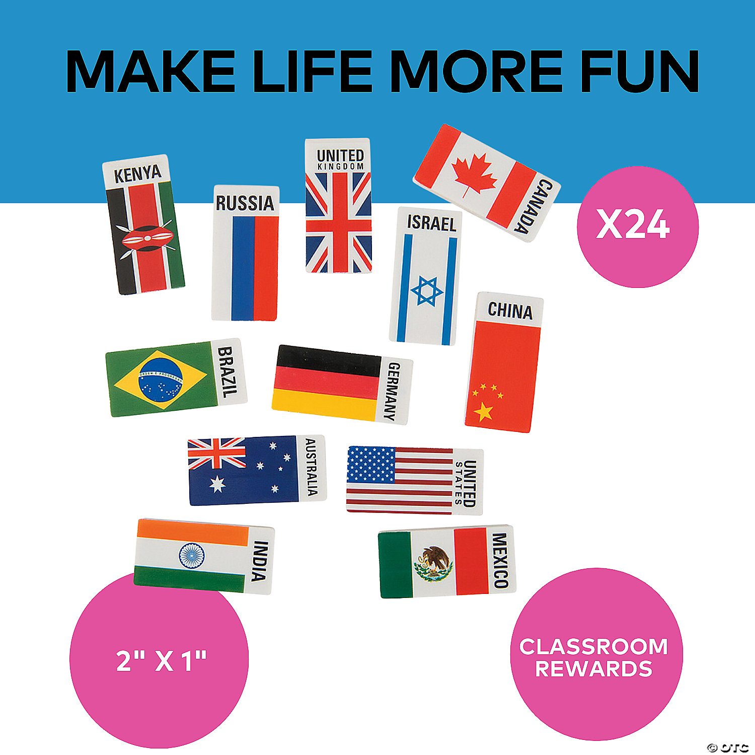 These erasers are cool school supplies that teach kids about the flags of the world! Featuring Germany, Israel, Russia, USA and more, they're fun classroom giveaways during multicultural and diversity studies or supplies for a Model U.N. Hand these giveaways out as rewards when students exhibit A+ knowledge about their country of choice! Rubber. (2 dozen per unit) 2" x 1" © OTC