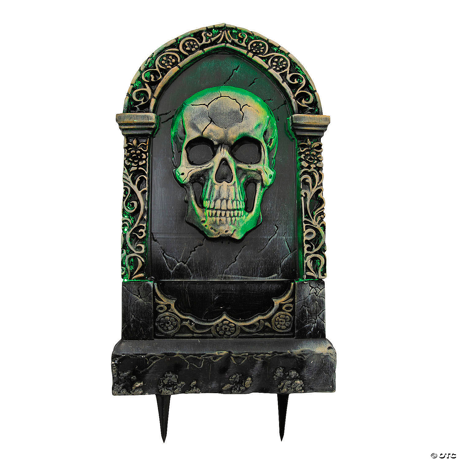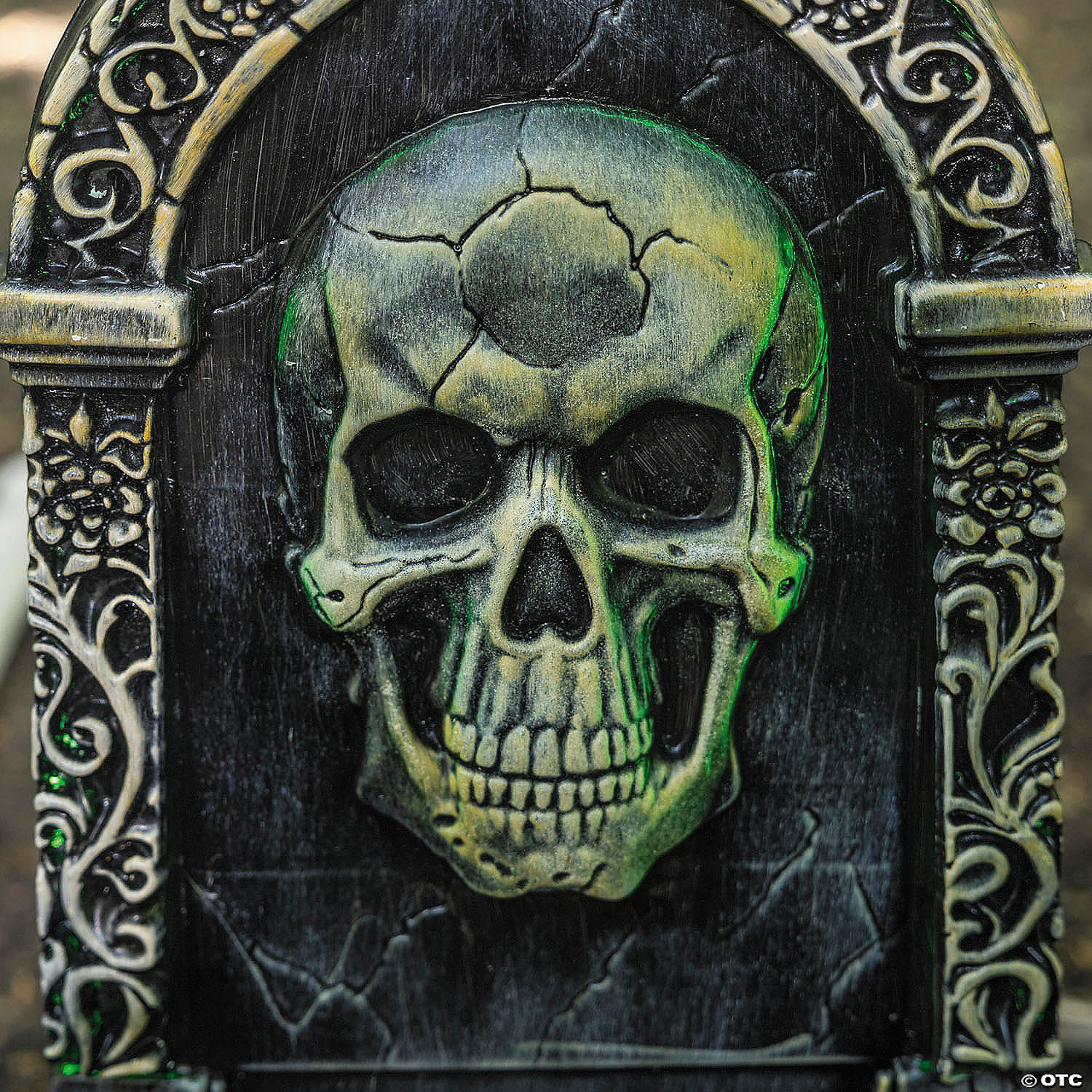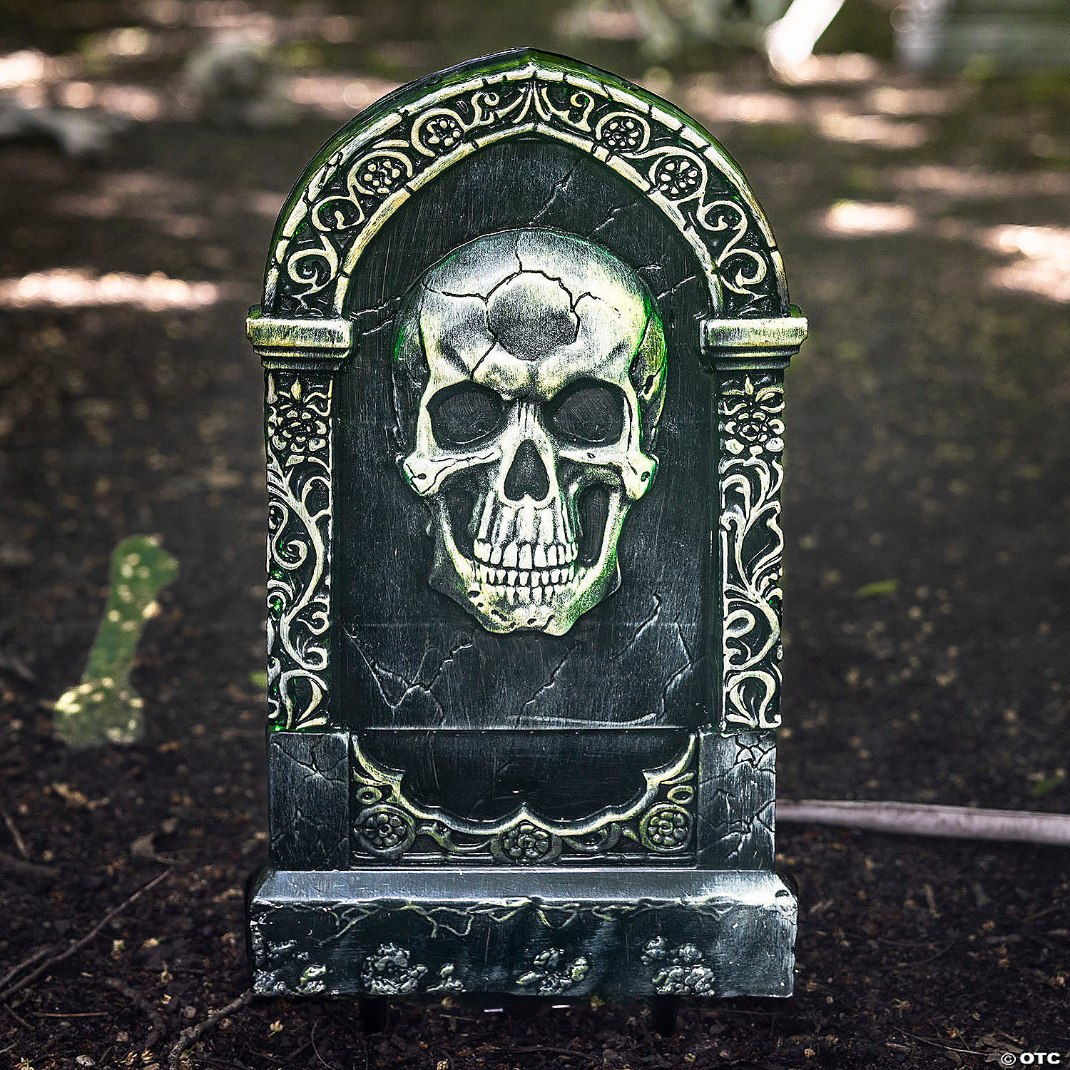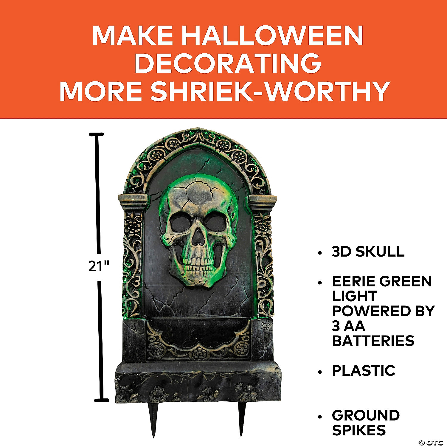 • TOMBSTONE WITH SKULL: This Halloween decoration includes a tombstone that has a skull image on it that is lit with a green glow.