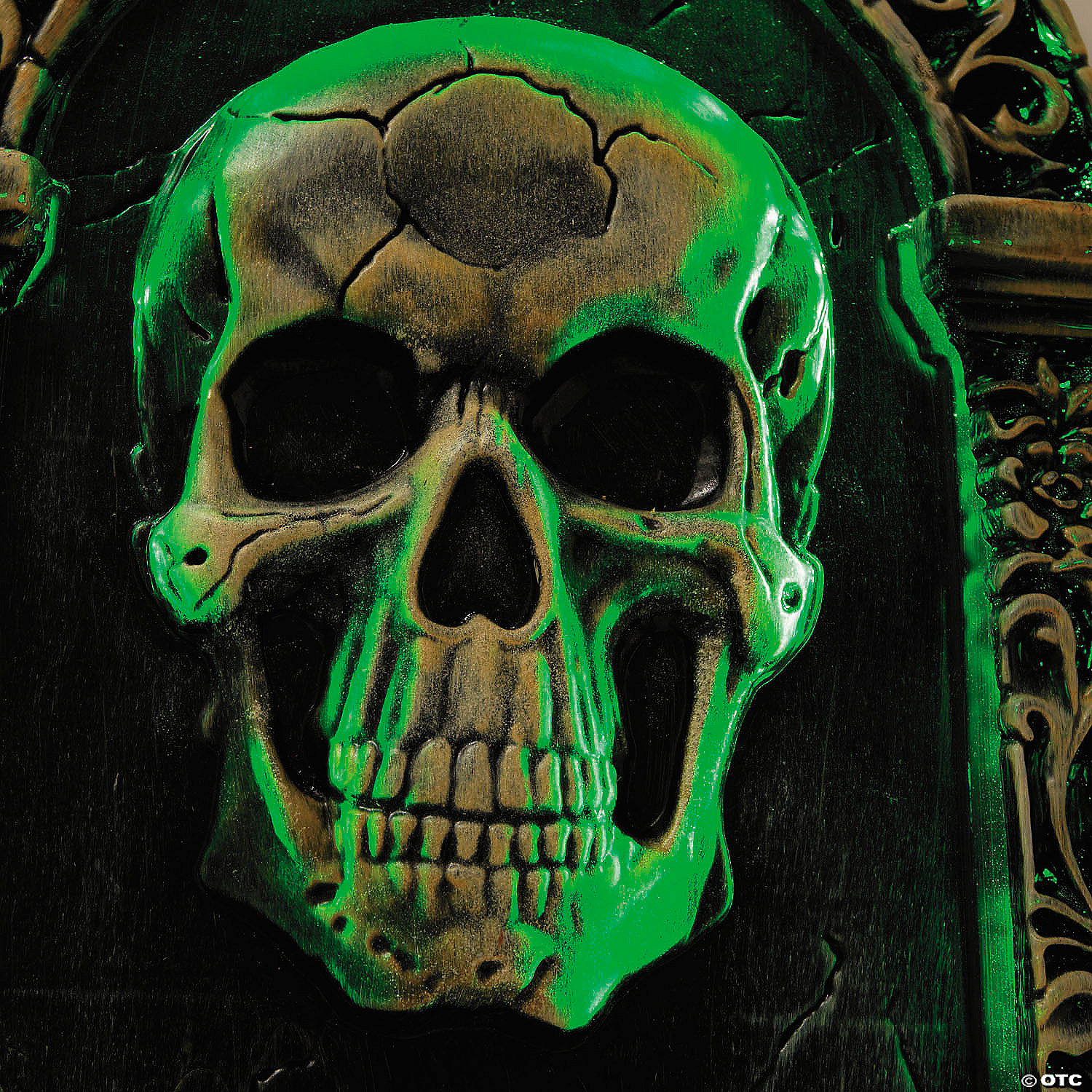 A shriek-worthy addition to your Halloween displays, this tombstone features a worn appearance with detailing around the outside edge surrounding a 3D skull in the middle. The skull has a cracked forehead and malicious grin that is lit with a green glow. Eerie and entertaining, this tombstone decoration is perfect for front yard displays, a haunted house or party photo booth. Requires 3 AA batteries, not included.