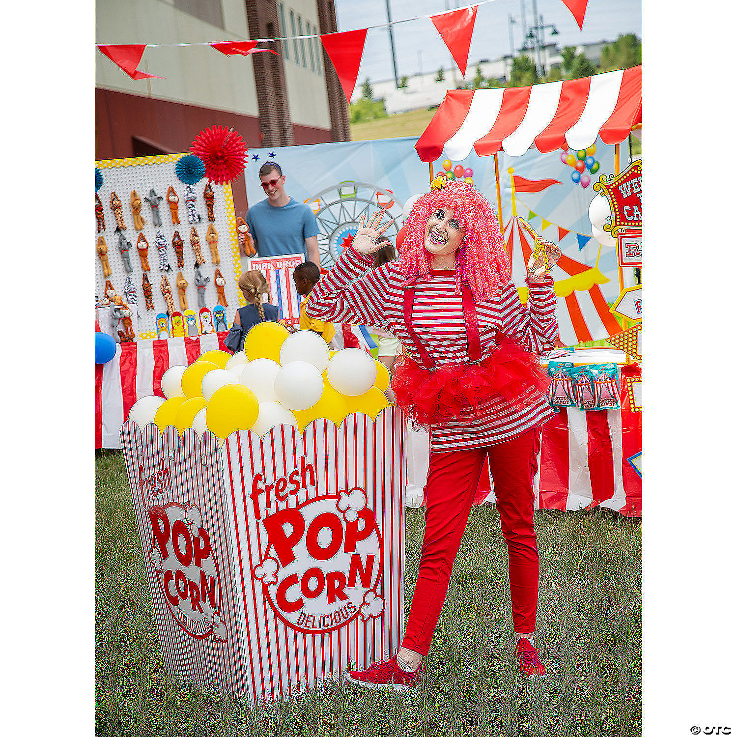 We hope you have a big appetite for fun! A great addition to movie night, carnival and party decorations, this stand-up comes designed to look like a very large popcorn box, complete with popped kernels. Kiddos and adults will both love posing with this oversized photo prop. To give the look of an overflowing offering of popcorn, simply tape the balloons to the top. Hold the butter, please! Includes 12 white and 12 yellow 9" latex balloons. Simple assembly required. © OTC