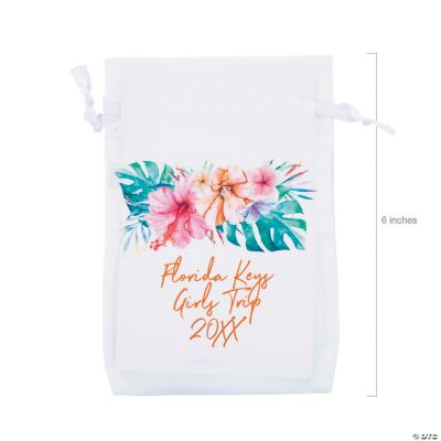 Hand out some impressive luau favor bags to students, employees or party guests with these cute and personalized drawstring bags. These satin bags are perfect for filling with goodies (sold separately on this website) and handing out as luau treats! These cute bags have a cute hibiscus image and personalized text. (2 dozen per unit) 4" x 6" Personalize with 3 lines of text. © OTC