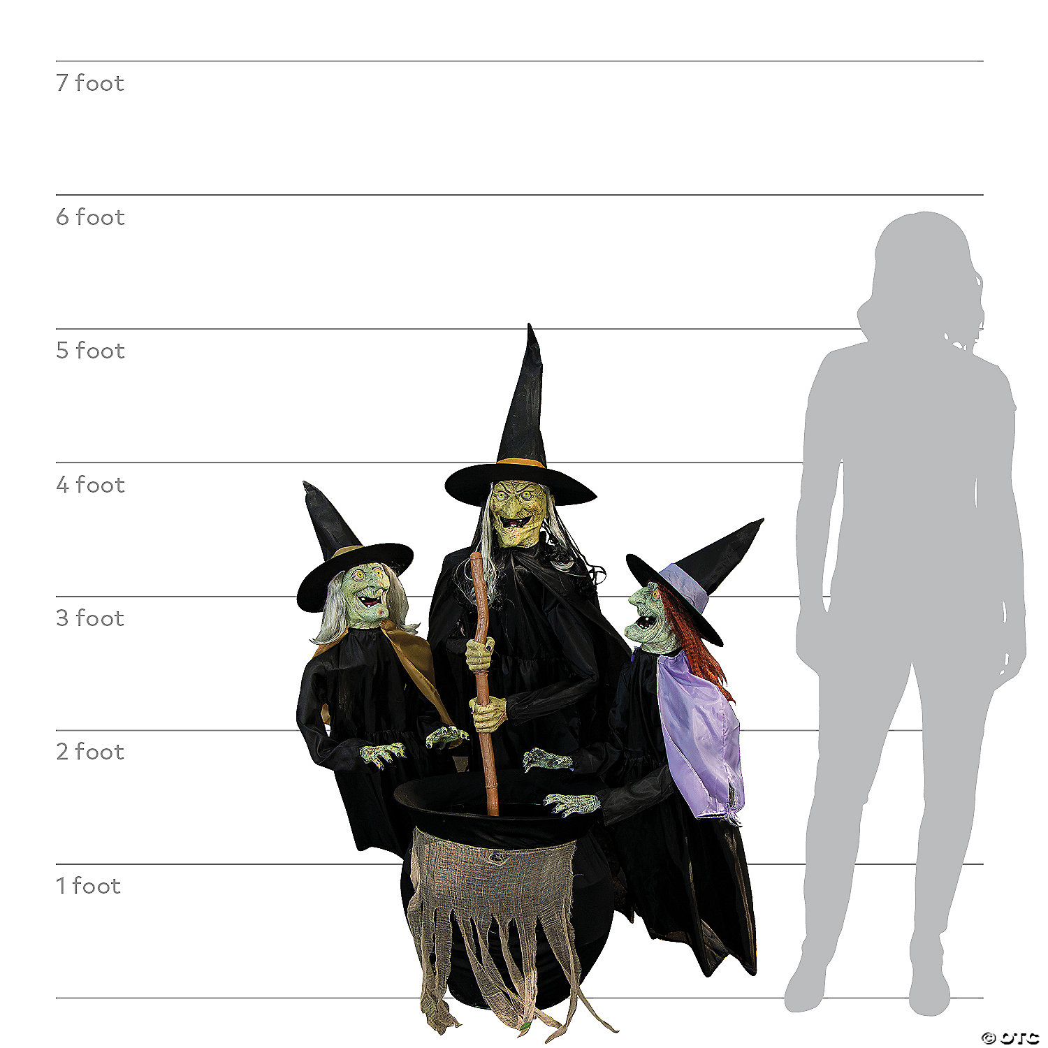 Oh, what a lovely sight to see, a large cauldron with witches, 3! Large witch in middle seems to be the ringleader as she continues to stir the pot taunting and spouting spells to passersby while the other 2 cackle and listen intently. Choose from Steady-On, Infra-Red Sensor, or Step-Here Pad (included) activation options to operate. This is an awesome Halloween decoration that completes your frightening party décor, or add it to your collection of haunted house props. Simply plug into any 110v outlet. Assembly required. Polyester, plastic, metal and electronics. 5’ tall x 4’ wide x 3’ deepPolyester, plastic, metal and electronics. 5’ tall x 4’ wide x 3’ deepSpecial Shipping Information: This item ships separately from other items in your order. Imported.