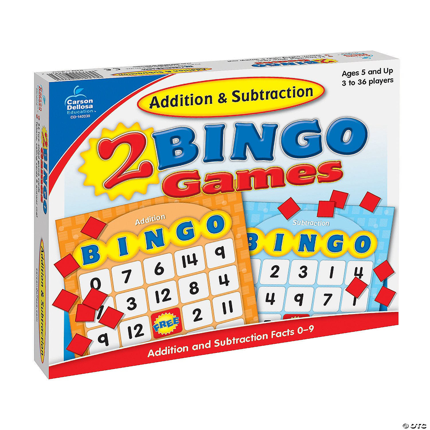 Two great games in one! These fun, Bingo games support NCTM standards and each side of the double-sided answer mat features a different skill. Perfect for use with the entire class or just small-group instruction, they include 36 double-sided game cards, 720 tokens, 100 calling cards, a double-sided answer mat, and a game guide. Paper. 10" x 8.25".