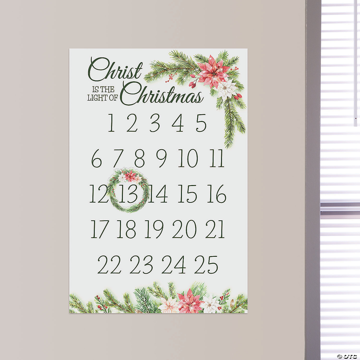 Celebrate the countdown to Jesus’ birthday with this advent calendar wall cling! Move the included wreath to the current date for a beautiful visual as you creep closer and closer to the big day. With radiant imagery and a reminder that “Christ is the Light of Christmas,” this advent calendar makes a great Christmas decoration for you as well as a thoughtful gift to loved ones. Remove, reposition and reuse as often as needed. Created with high quality vinyl that’s made to last, walls stay completely safe, and sticky residue is never left behind. Vinyl. 17" x 25" © OTC