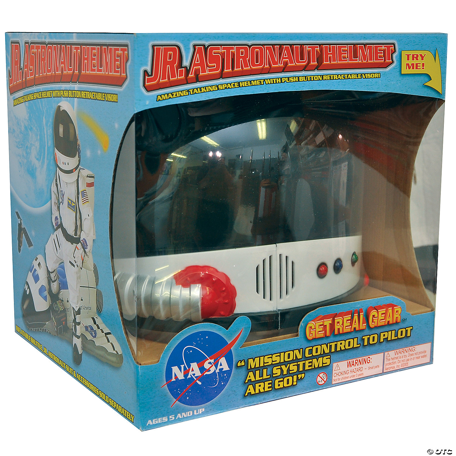 To space and beyond. Includes: Hard plastic design with sound chip, push button activation with real space agency speak. Push button activates spring loaded retractable visor and mock boom microphone inside of helmet. Available Sizes: One size fits most children 8 and up. Please note, additional padding may be needed for children.