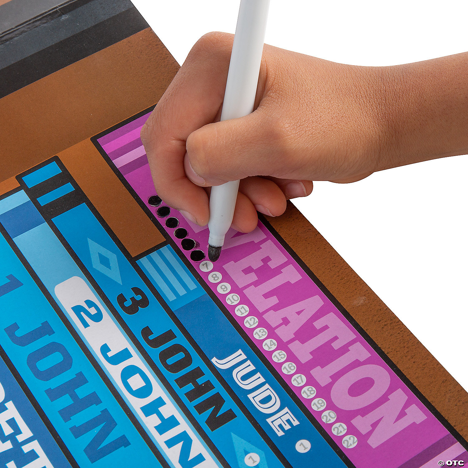 Here is a clever way for Sunday School students or Bible study participants to keep track of their Bible reading! These dry erase boards list out every book of the Bible in an attractive bookshelf format. Each book has number bubbles to indicate chapters so readers can mark out each bubble as they complete chapters. Laminated cardstock. (6 pcs. per set) 6" x 24" Dry erase markers sold separately on this website. © OTC