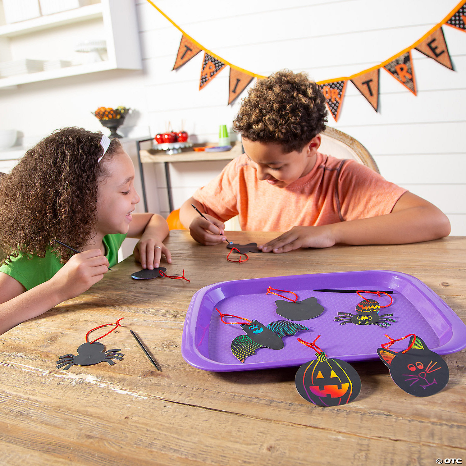 Are you looking for Halloween craft supplies to use at classroom Halloween parties and school events? These Magic Color Scratch activities feature shapes of Halloween characters and are a craft for kids to complete during your fright night festivities. With plenty to go around, kids of all ages can simply scratch away the black surface to reveal a rainbow of colors. Includes assorted Halloween shapes, scratching tools and satin cords. Assortment may vary. © OTC