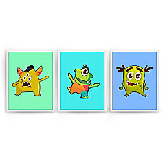 Monster Buddies Set of 3 White Framed Canvas by Dancing Littles Jungle - Size 16x24 Inch