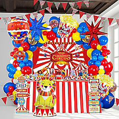 Carnival Circus Theme Birthday Party Decorations & Include Red Blue Yellow Balloon & Foil Hot Air Popcorn Balloons & Striped Banner Tablecloth & Backdrop Carni