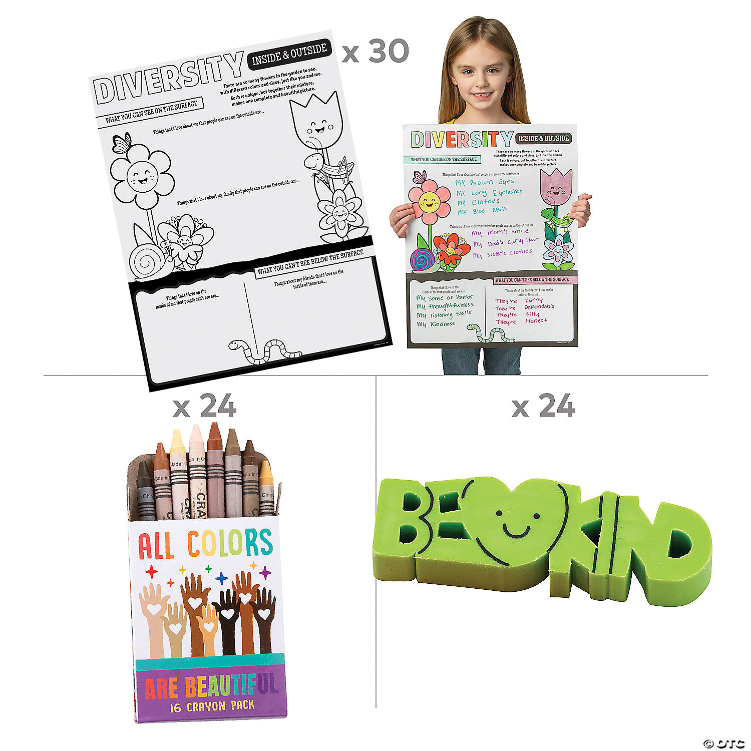 A great way to celebrate inclusions, this diversity kit includes a coloring activity and a collection of crayons featuring a variety of skin tones and a rainbow of colors. This fun educational activity prompts kids to think about traits they love about their friends, going beyond skin deep to think about things that make people special and how we can respect each other’s differences. Teachers can use this poster as a hands-on activity to supplement a lesson on diversity and acceptance in the classroom…and beyond! (78 pcs. per unit)Includes:• 24 Rubber Be Kind Word Erasers (1 3/4")• 30 Paper Color Your Own “Diversity Inside & Outside” Posters (16" x 20 3/4")• 24 Boxes of 16-Color Diversity Crayons (Includes 16 assorted crayons per box. Safe and non-toxic. 3 1/2" Conforms to ASTM D-4236.)• Assortments are subject to change at any time and may vary from picture shown. Substituted items will be similar in nature.