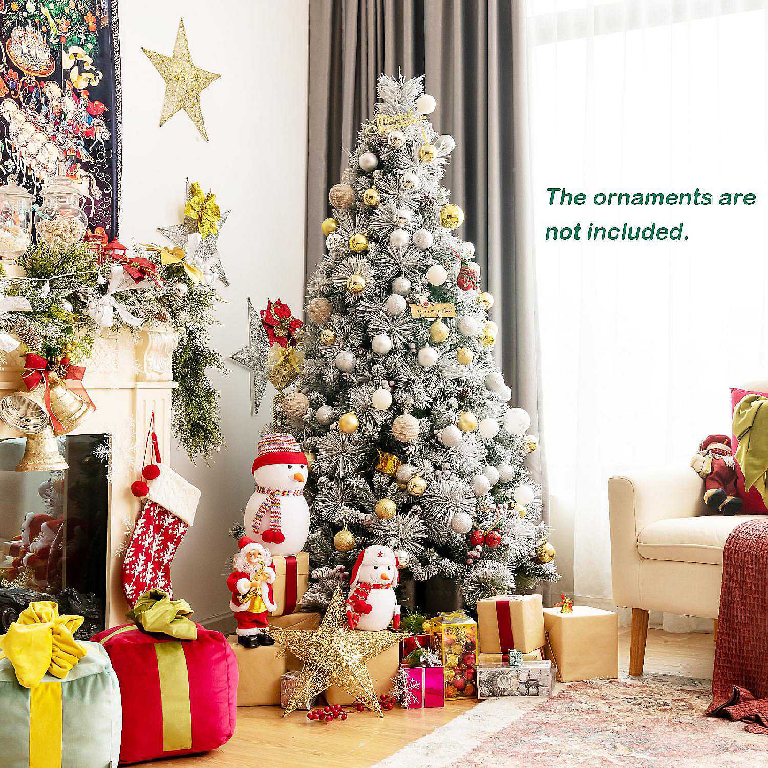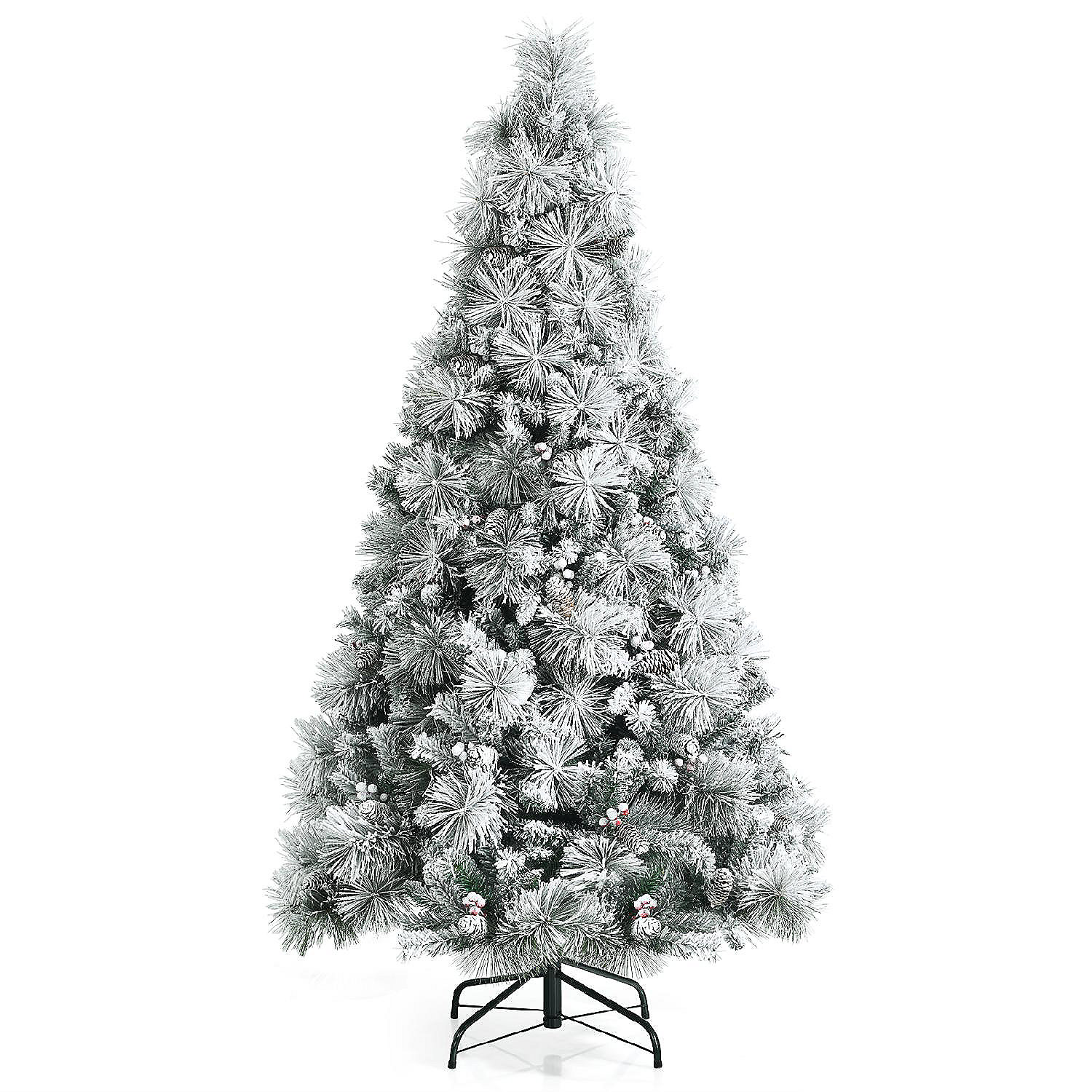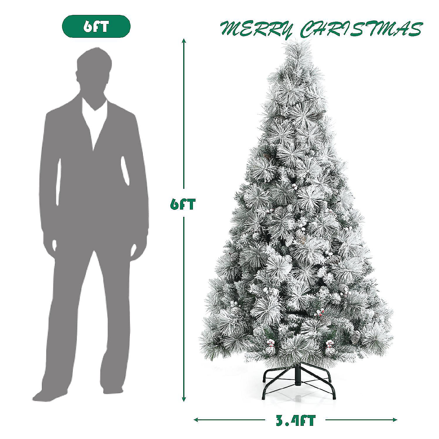 Costway 6ft Artificial Christmas Tree, Snow Flocked Hinged Xmas Tree w/ Pine Needles, Red Berries, Pine Cones & Metal Base