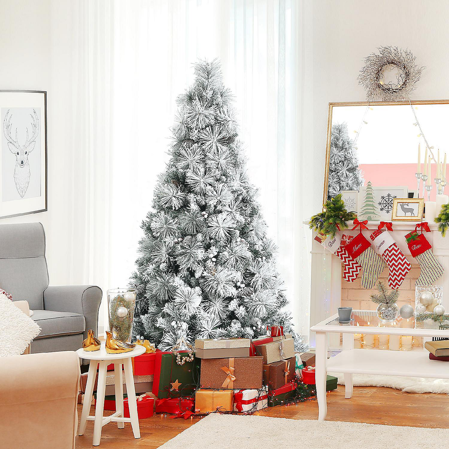Here comes a beautiful snow flocked Christmas tree, which can bring warmth and vitality to your home. With 652 branch tips, the shape of the tree is rather full and lush. And all leaves are made of 100% new PVC, which has a brighter color than recycled material. Sprayed with white powder, the snow flocked tree looks as natural as a real pine tree grown in snowy winter. Trimmed with classic pine cones and red berry clusters, this tree is full of festive feeling and will be very attractive. Except home, you can also place it to decorate office, party, trade activities, for it can create a Christmas atmosphere for you. The hinged branches and separated sections provide convenience for setup and storage. Get one Xmas tree to decorate your home!SpecificationColor: Green Material:New PVC, Metal Product