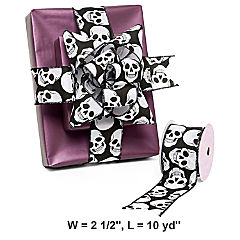 LaRibbons 2 1/2" Wired Ribbon - Trick or Treat Skulls on White - 10 Yard Roll