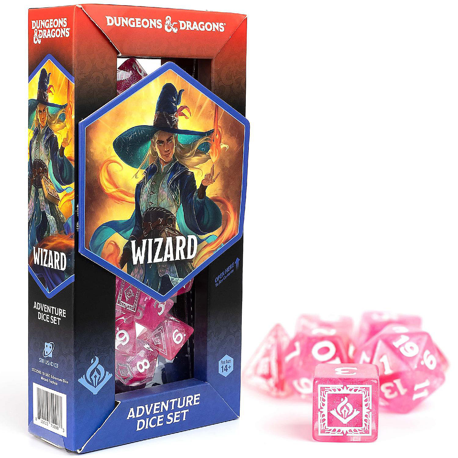 D&D ADVENTURE DICE: WIZARD - FUCHSIA - Harness arcane knowledge with the officially licensed Dungeons & Dragons Adventure Dice Set for Wizards in a vibrant fuchsia. Crafted to embody the wisdom and mystique of the Wizard class, with dice tailored for casting epic spells and shaping the fabric of reality. Perfectly complementing the intellectual nature of Wizards. This set is tailored to the needs of the Wizard, with dice perfect for casting powerful spells and unraveling the mysteries of the universe. Whether you're delving into ancient tomes or summoning magical forces, these dice will empower your Wizard's journey with every roll. WIZARDS are defined by their exhaustive study of magic's inner workings. They cast spells of explosive fire, arcing lighting, subtle deception, and spectacular transformations. Tabletop roleplaying game accessory. 16 PIECE DICE SET INCLUDES: 1 x d4, 2 x d6, 4 x d8, 4 x d10, 2 x d12, 1 x d%, 2 x d20.