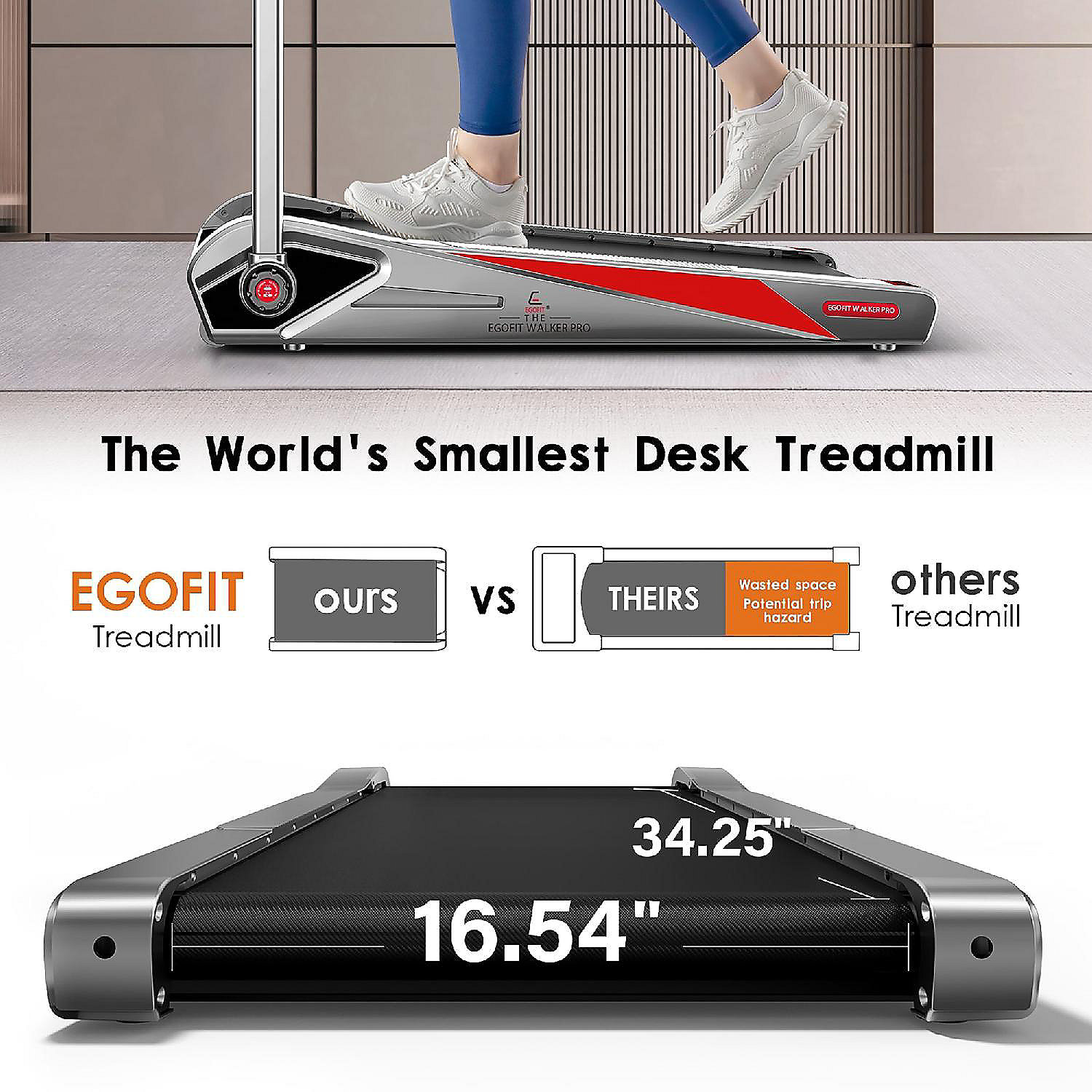 EGOFIT WALKER PLUS M1T - 2-IN-1 FOLDING HANDLEBAR TREADMILL - WALKING & JOGGING - 2-in-1 Folding Under Desk Walking Pad Treadmill with handlebar. The small under-desk treadmill is the ideal way to get more out of your standing desk, letting you burn more calories, as well as reducing stress and decreasing back pain. The compact design makes our Egofit Walker Plus treadmill a perfect addition to your home office, fitting virtually anywhere. It's a compact treadmill that comes fully assembled! EASY FOLDING HANDLEBAR: No extra tools needed. Put the bar in the upright position to have a rail bar to hold onto or fold down to easier fit under a standing desk. POWERFUL MOTOR: The 2.0 HP motor allows for a higher user weight: Max User weight 220lbs or 100kgs. Mini size while keeping the same power as a motorized walking treadmill! Regardless of bad weather, it enables you to perform workouts in your office, living room or bedroom any time. UNIQUE 5% INCLINE: Ergonomic fixed incline is designed to boost your calorie burn faster. Under Sink Motor Design: Delivers big stride-friendly workouts without worrying about hitting your toes on a large end plastic cap. EASY TRANSPORT: The portable treadmill features maneuverable wheels allowing it to be easily moved. Its compact design easily fits in the trunk of your car. LOW SOUND LEVEL is less than 70DB even in its max speed, to ensure no disturbance breaks in your working, reading or other activities. Placing it on a mat on the carpet can dampen the sound even further. BY YOUR SIDE FOR YEARS TO COME: Our desk treadmill is manufactured with a well-made solid structure. Made of premium grade steel, it is designed to support max loads of 220 lbs., meaning our walking pad treadmill is extremely durable and dependable