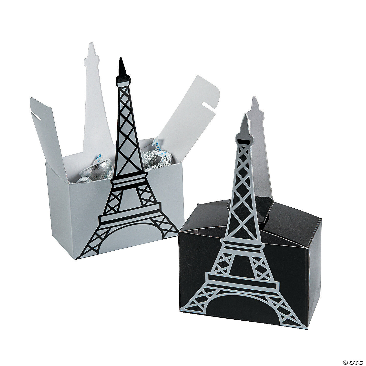 These Eiffel Tower Favor Boxes make it easy to give each party guest a taste of France. They're ideal Paris Party supplies for your Parisienne party! With a 5" Eiffel Tower featured on each paper box, these treat boxes make a wonderful addition to any bon voyage party or globetrotting event. Cardstock. 3" x 1 1/2" x 2" Simple assembly required. © OTC