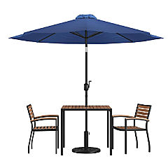 Emma + Oliver 5 Piece Outdoor Patio Dining Table Set with 2 Synthetic Teak Stackable Chairs, 36" Square Table, Navy Umbrella & Base