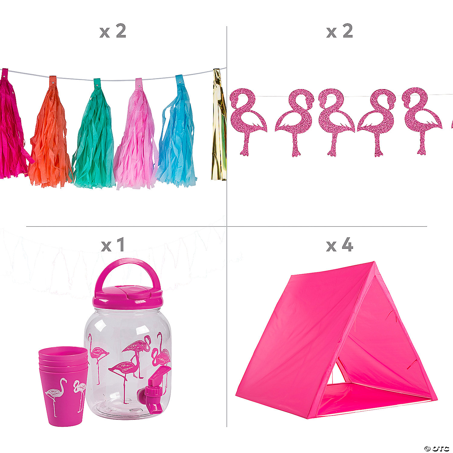 A flamingo-fied night of fun and treasured memories await your party guests with the help of this kit! Featuring decorations, party supplies and tents to sleep in, your birthday girl can invite 3 of her friends to join in on the special occasion. Supplement this kit with a few favorite party treats and games to play and you’re on your way to creating an unforgettable night! (13 pcs. per unit)Includes:• 2 Tissue Paper Bubblegum Tassel Garlands (6 ft. x 6")• 5-Pc. Plastic Flamingo Drink Dispenser with Cups Kit (Dispenser, 8" 80 oz.; cups, 3-1/2" 6 oz.)• 2 Paper Flamingo Glitter Garlands (5" x 6 ft.)• 4 Nonwoven Polyester Pink Sleepover Tents (45" x 43" x 40" Simple assembly required.)• Assortments are subject to change at any time and may vary from picture shown. Substituted items will be similar in nature.