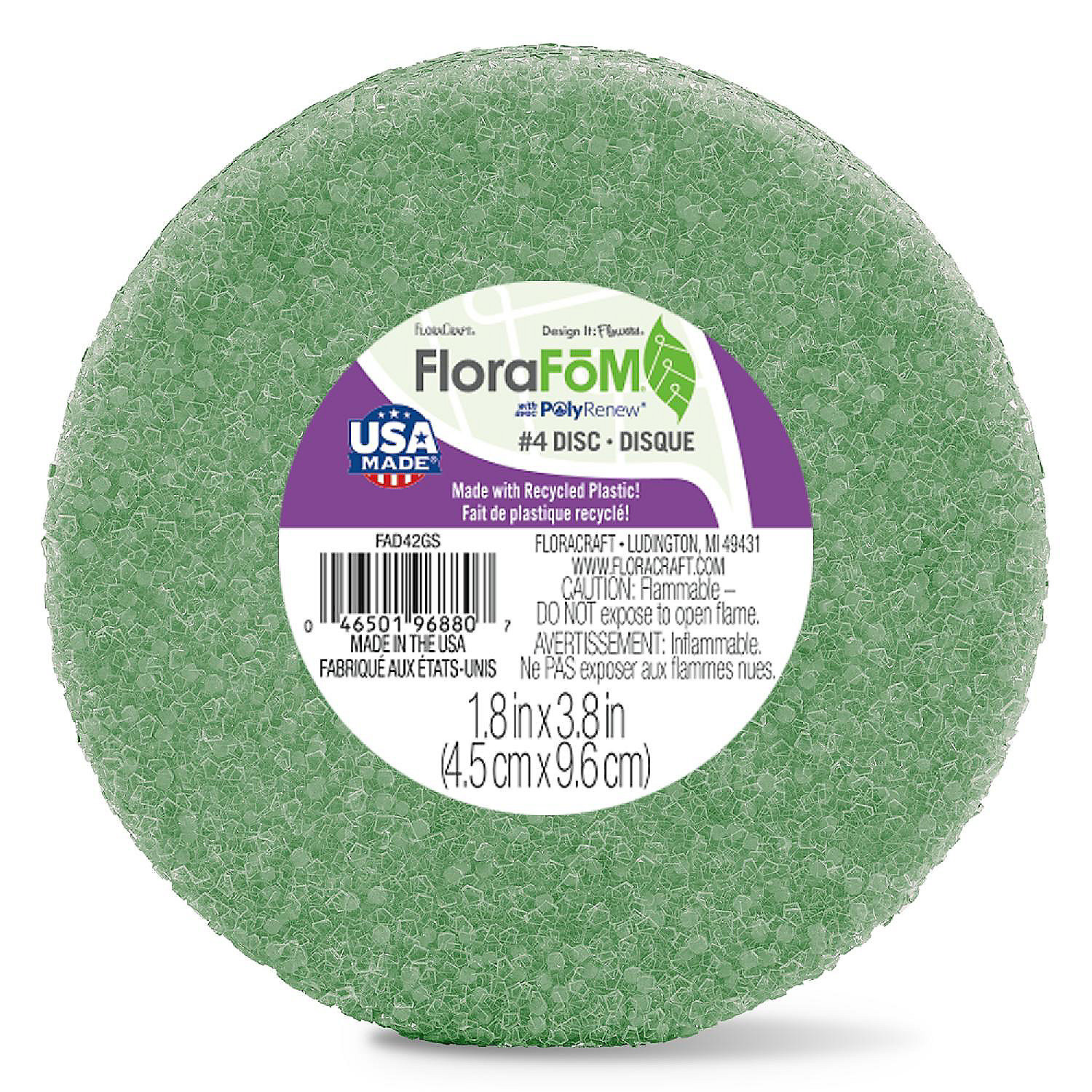 Start your floral displays and event decorations off with the right base by using FloraCraft FloraFoM - now made with recycled plastic! Its crunchy cell structure is great for holding artificial flower stems, heavy-stemmed naturals (like branches and twigs) and floral picks in place. It can also be cut, shaped, painted or textured to create any customized home or event decor. Plus, FloraCraft FloraFoM is suitable for both indoor and outdoor use. This package contains one 1.8 x 3.8 inch green foam disc. Made in the USA.