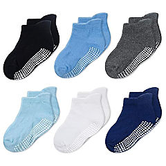 Non-Slip Crew Grip Toddler Socks, 6 Pack for Boys, Black/Blue/Light Blue/Gray & Stripes, 1-3 Years Old