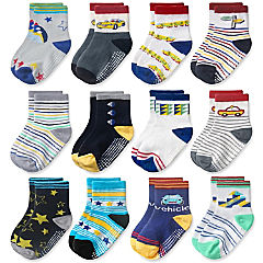 Non-Slip Crew Grip Socks, 12 Pack for Baby Boys and Girls, Assorted Colors and Patterns, 6-12 Months