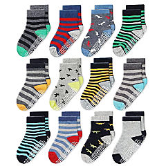 Non-Slip Crew Grip Toddler Socks, 12 Pack for Boys, Stripes & Dinosaur Design, 1-3 Years Old