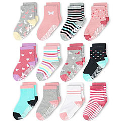 Non-Slip Crew Grip Toddler Socks, 12 Pack for Girls, Hearts & Stripes, 1-3 Years Old