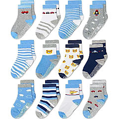 Non-Slip Crew Grip Toddler Socks, 12 Pack for Boys, Black/White/Gray/Blue/Light Blue, 1-3 Years Old