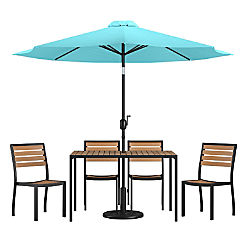 Emma + Oliver 7 Piece Patio Table Set - 4 Synthetic Faux Teak Stackable Chairs - 30" x 48" Faux Teak Table - Teal Umbrella with Base