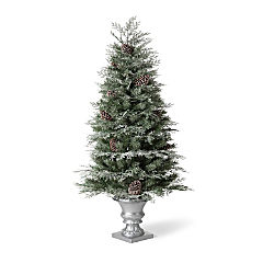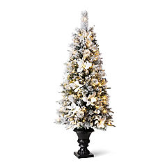 Glitzhome 5ft Pre-Lit Flocked Pine Artificial Christmas Porch Tree with 150 Warm White Lights and Poinsettia