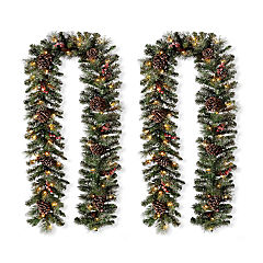 Glitzhome Set of 2  9ft Pre-Lit Glittered Pine Cone Christmas Garland, with Warm White LED Lights with Timer, Three Function