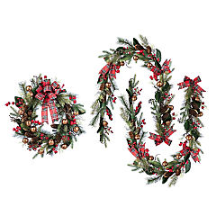 Glitzhome Set of 3 24"D Christmas Bell, Pinecone & Berry Bow Wreath and Matched 6ft Garland Set