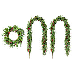 Glitzhome Set of 3 24"D Christmas Greenery PE Dripping Cedar  Wreath and Matched 9ft Garland Set