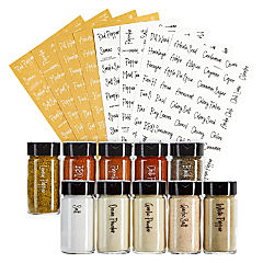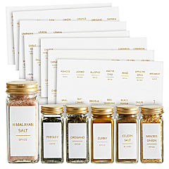 Talented Kitchen 24 Pack Glass Spice Jars with Shaker Lids 6oz, 328 Preprinted Labels, Gold Caps