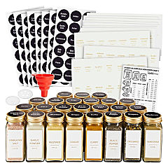24 Pack Glass Spice Bottles with 284 Preprinted Label Stickers, 4 oz Empty Square Seasoning Jars with Shaker Lids & Gold Caps