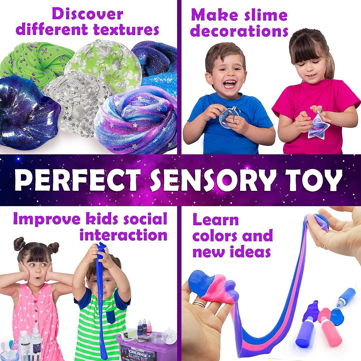 Create the best sparkly, colorful galaxy slime! Create Pink, Purple & Blue glitter slime para niños and twist them together to form awesome sparkly galactic slime. Featuring Glow In The Dark stars & slime powder! A great science set with containers AND MORE. Our set is kid tried and tested, we've made sure it's fun, simple and everything is in one box. There are safety instructions and the kit slime para niñas or fabrica slime should always be used under adult supervision as some of the ingredients could cause harm if inhaled or come in contact with eyes. We love to see kids experiment and have loads of fun. You can make loads of different colors. Grab the kit now and keep the kids entertained.25-piece slime craft kit for ages 7-14 to create the best sparkly, colorful galaxy slime fluffy for kids DIY fun!