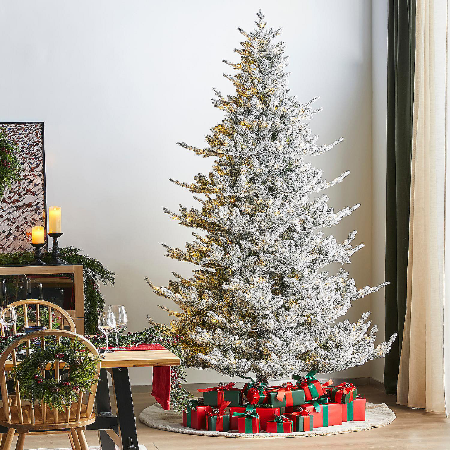 The9ft Pre-Lit Flocked Upward Slim Fir Christmas Tree features a snowy, flocked design with warm white lights, creating a unique, space-saving silhouette. Its sturdy metal stand ensures stability, making it easy to set up and adding sophistication to your holiday decor.1. Natural appearance look realistic, comes with sturdy steel metal stand, fits beautifully in both large and small spaces.