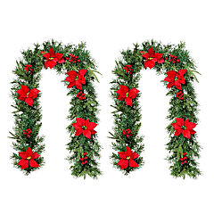 Glitzhome Set of 2 6ft Pre-Lit Greenery Pine Red Poinsettia and Berries Christmas Garland, with 50 Warm White Lights and Timer, Three Function