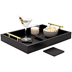 Decorative Wood Serving Tray with Handles and Coasters, Black, 16.5 x 12.2 x 3.1 In