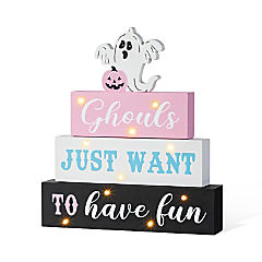 Glitzhome Set of 6 11.75"H Halloween Lighted Pink Wooden Ghost Block Word Sign