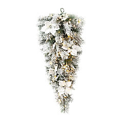 Glitzhome S/2 3ft Pre-Lit Flocked Greenery Pine White Poinsettia and Berries Christmas Teardrop with 50 Warm White Lights and Timer, Three Function