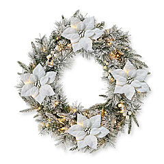 Glitzhome 24"D Pre-Lit Snow Flocked Greenery Pine Poinsettia Christmas Wreath, with 50 Warm White Lights with Timer, Three Function