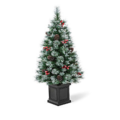 Glitzhome 4ft Pre-Lit Pine Artificial Christmas Porch Tree with 80 Warm White Lights, Pinecones and Red Berries