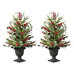 Glitzhome Set of Two 36"H Christmas Lighted Berry and Pine Cone Urn Porch Tree, 20 Warm White Lights with timer