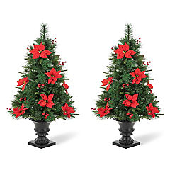 Glitzhome Set of Two 4ft Pre-Lit Pine Artificial Christmas Porch Tree with 100 Warm White Lights, Poinsettia and Red Berries