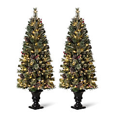 Glitzhome Set of Two 5ft Pre-Lit Pine Artificial Christmas Porch Tree with 180 Warm White Lights and Pinecones